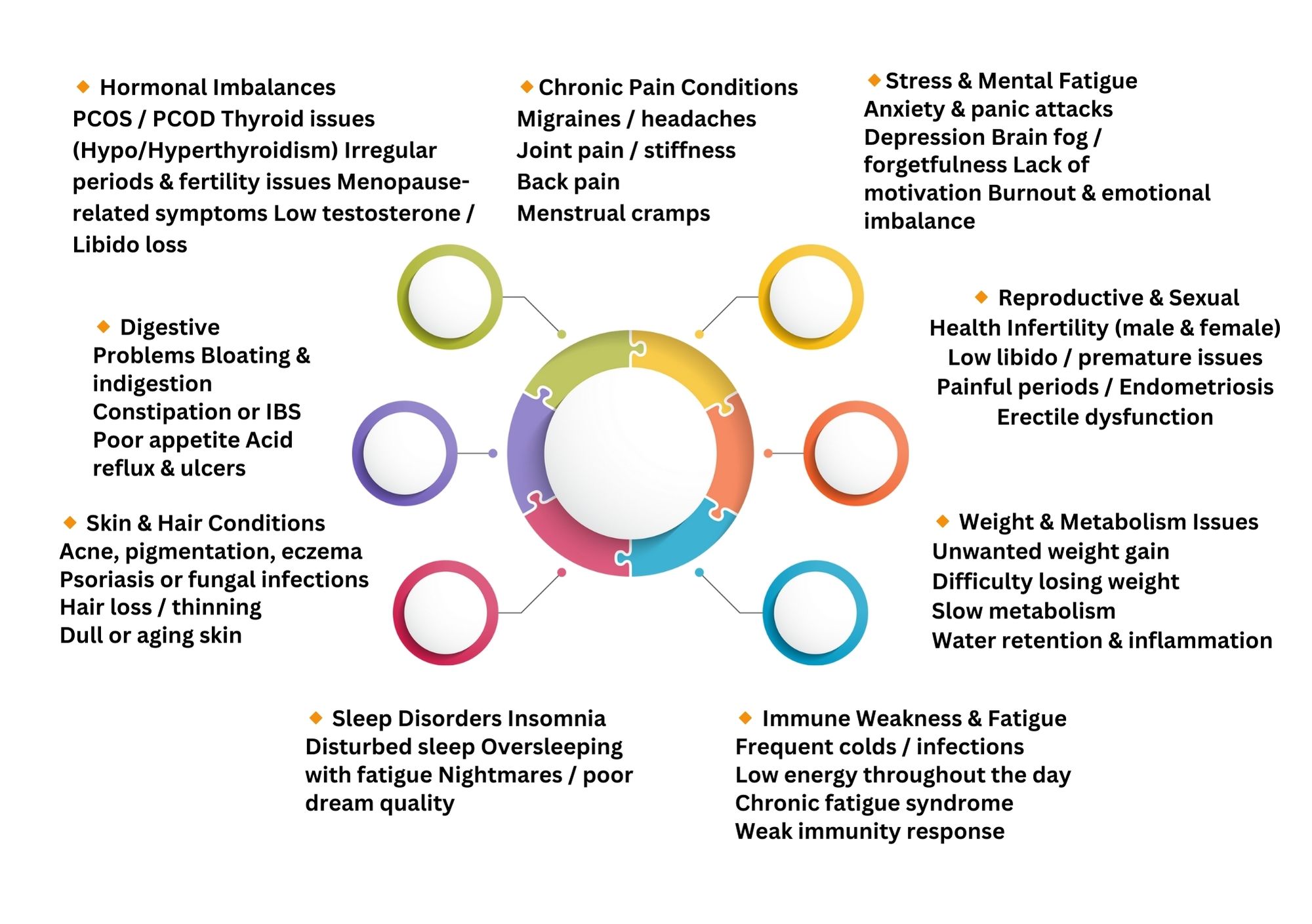 (PCOS, thyroid), stress, gut issues, anxiety, fatigue,